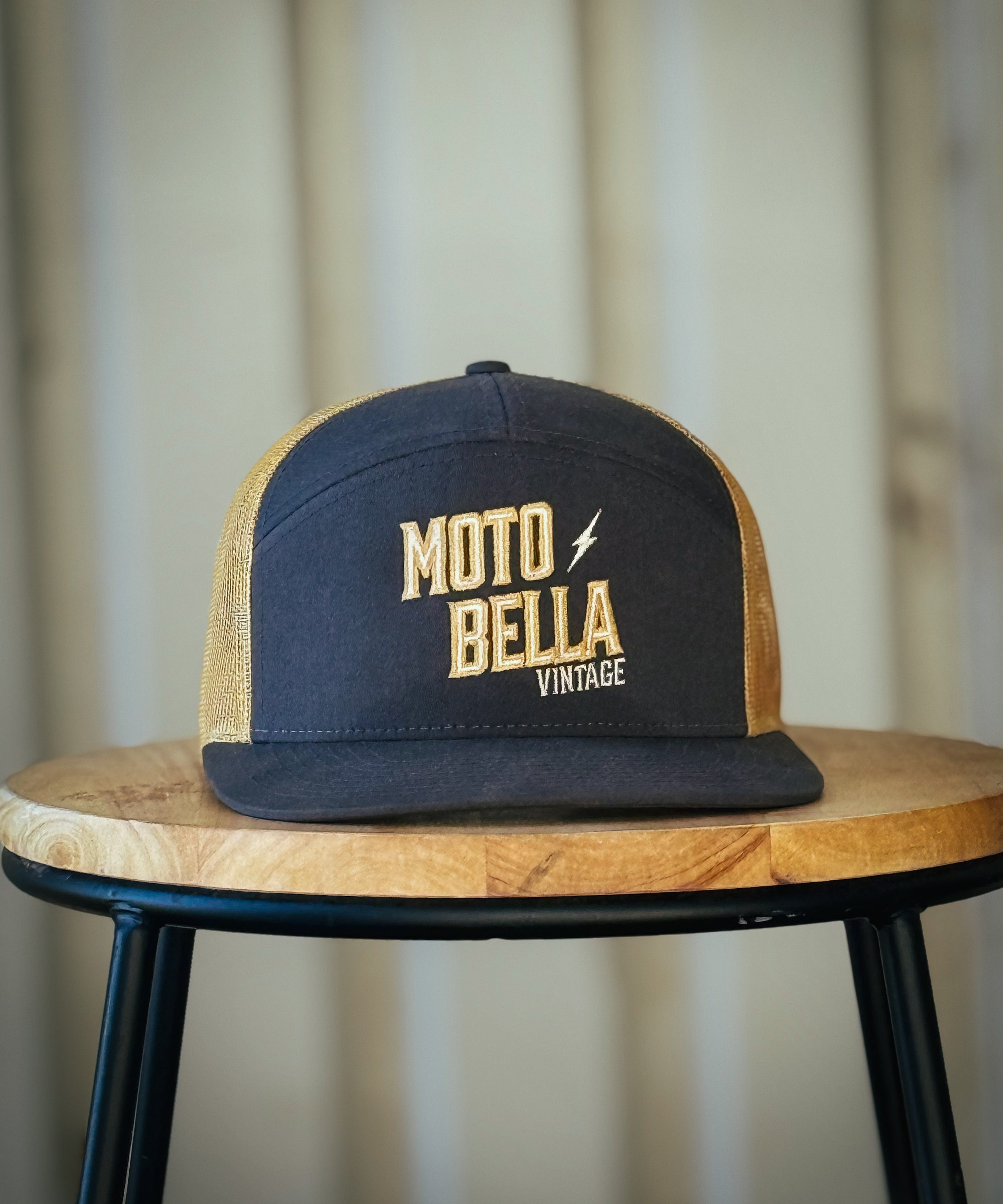 MotoBella Vintage Trucker Hat – Black & Gold Mesh