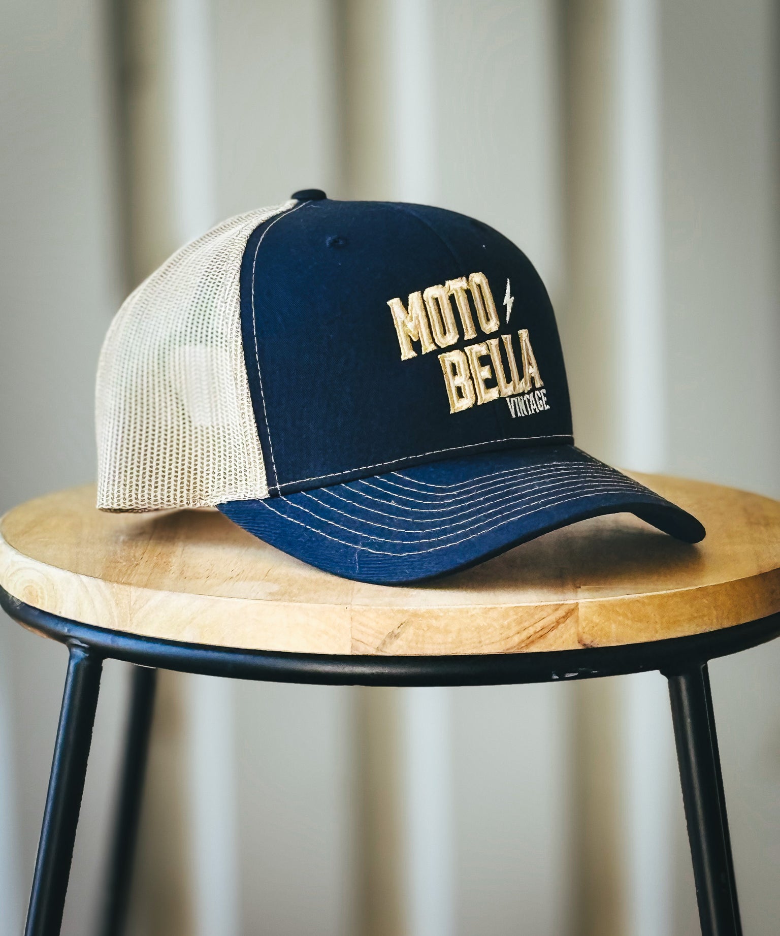MotoBella Vintage Trucker Hat – Navy & Tan Mesh