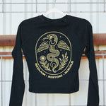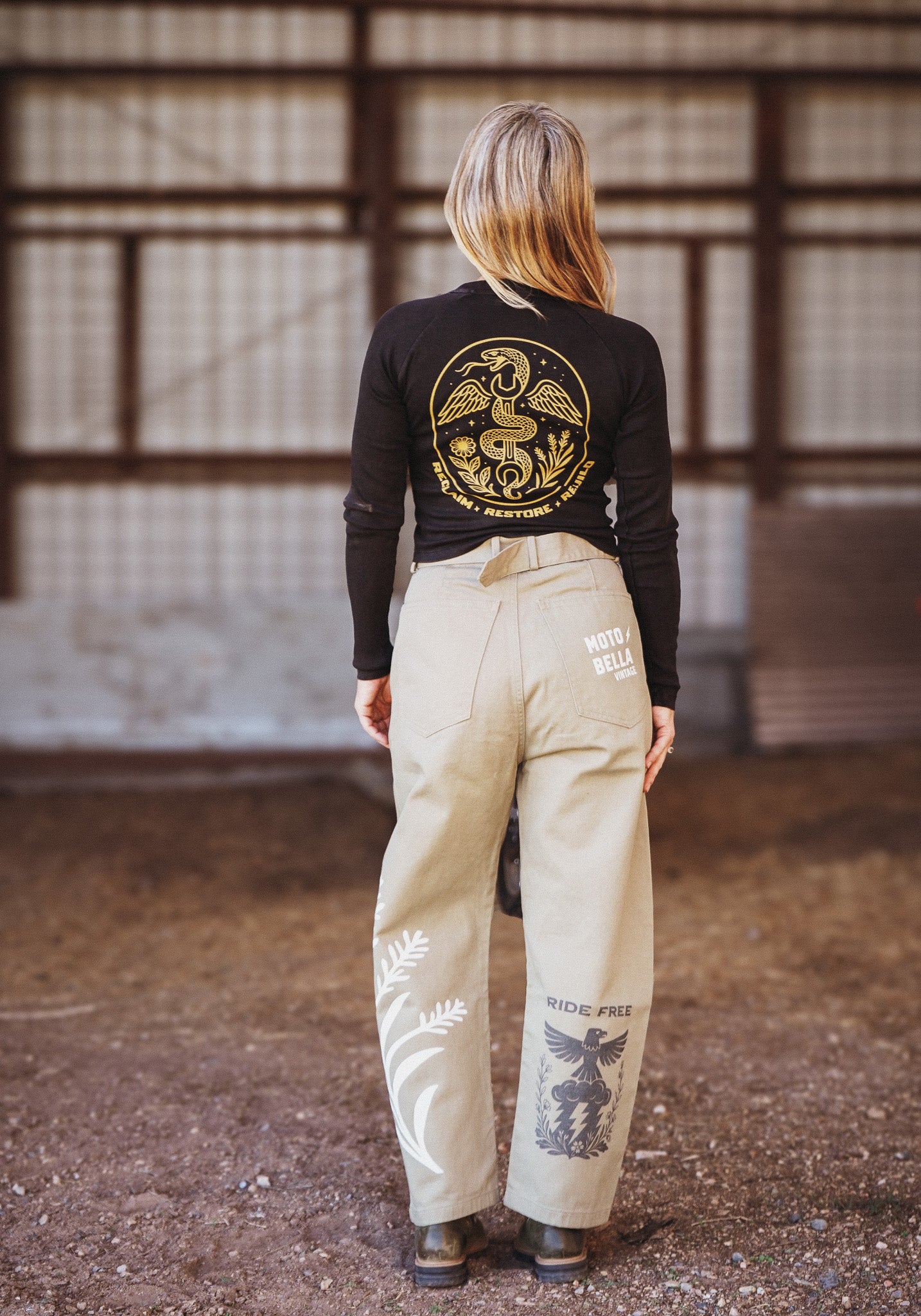 The Reclaim Raglan blends a vintage moto attitude with a soft, body-hugging fit that moves as you do. The water based ink-printed gold design — featuring the MotoBella serpent and wrench emblem — is a symbol of strength, transformation, and the women who rise, restore, and rebuild.