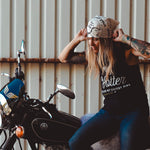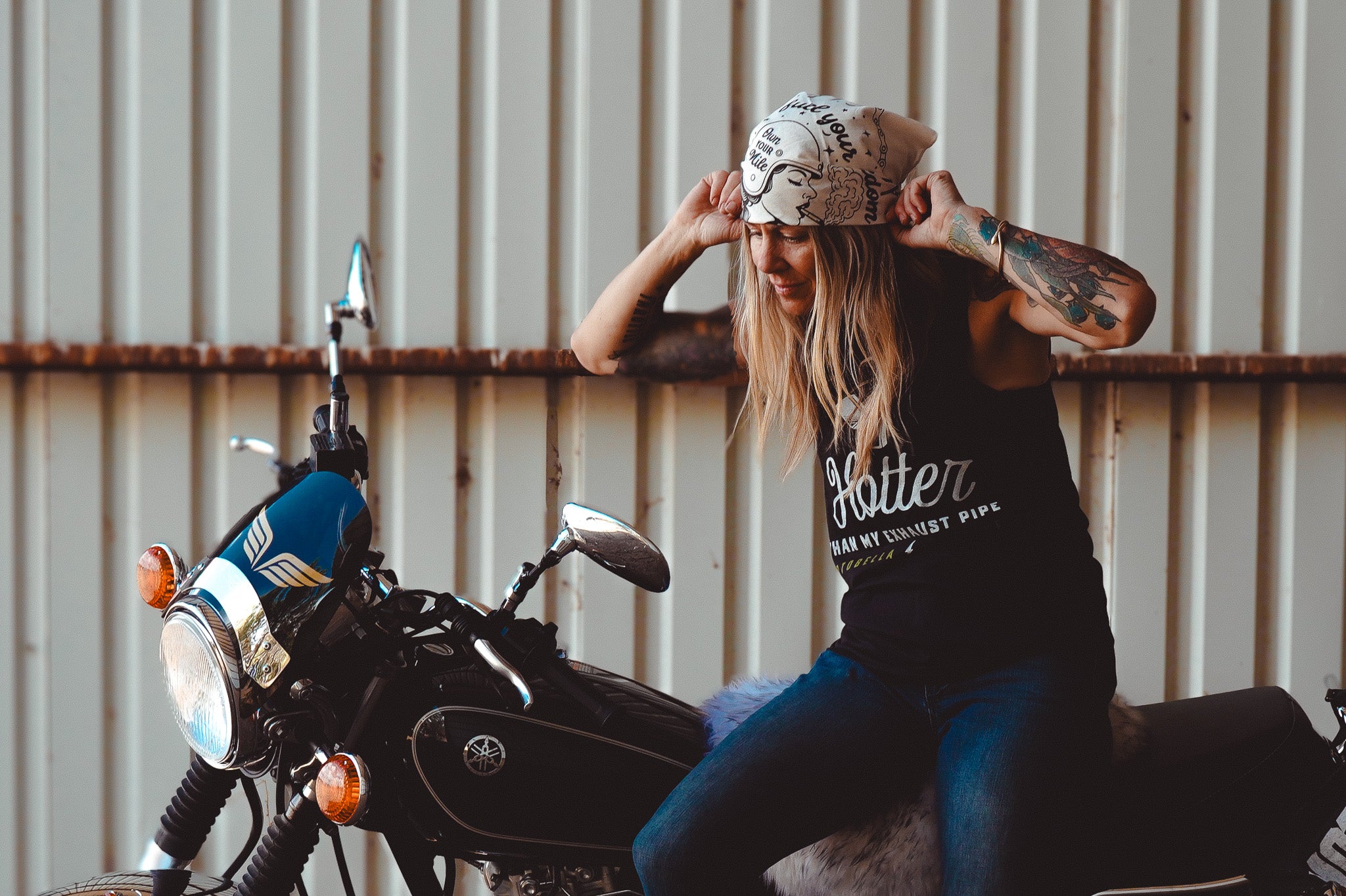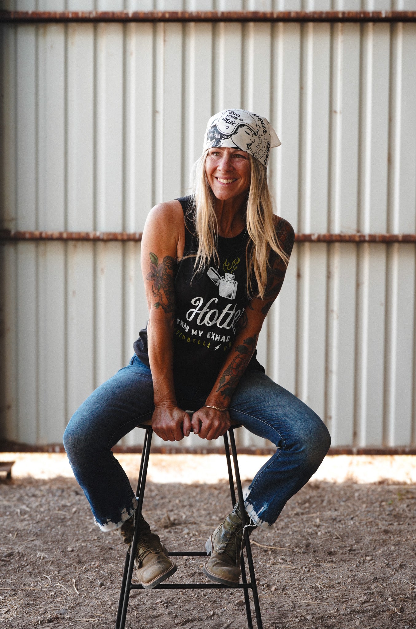 This isn’t just a bandana — it’s a collector’s piece of MotoBella soul. Screen printed on natural cotton, the Fuel Your Freedom design celebrates the rebel spirit of women who own every mile. Featuring a vintage moto muse surrounded by roses, lightning bolts, checkered flags, and stars, this piece carries the heart of MotoBella.