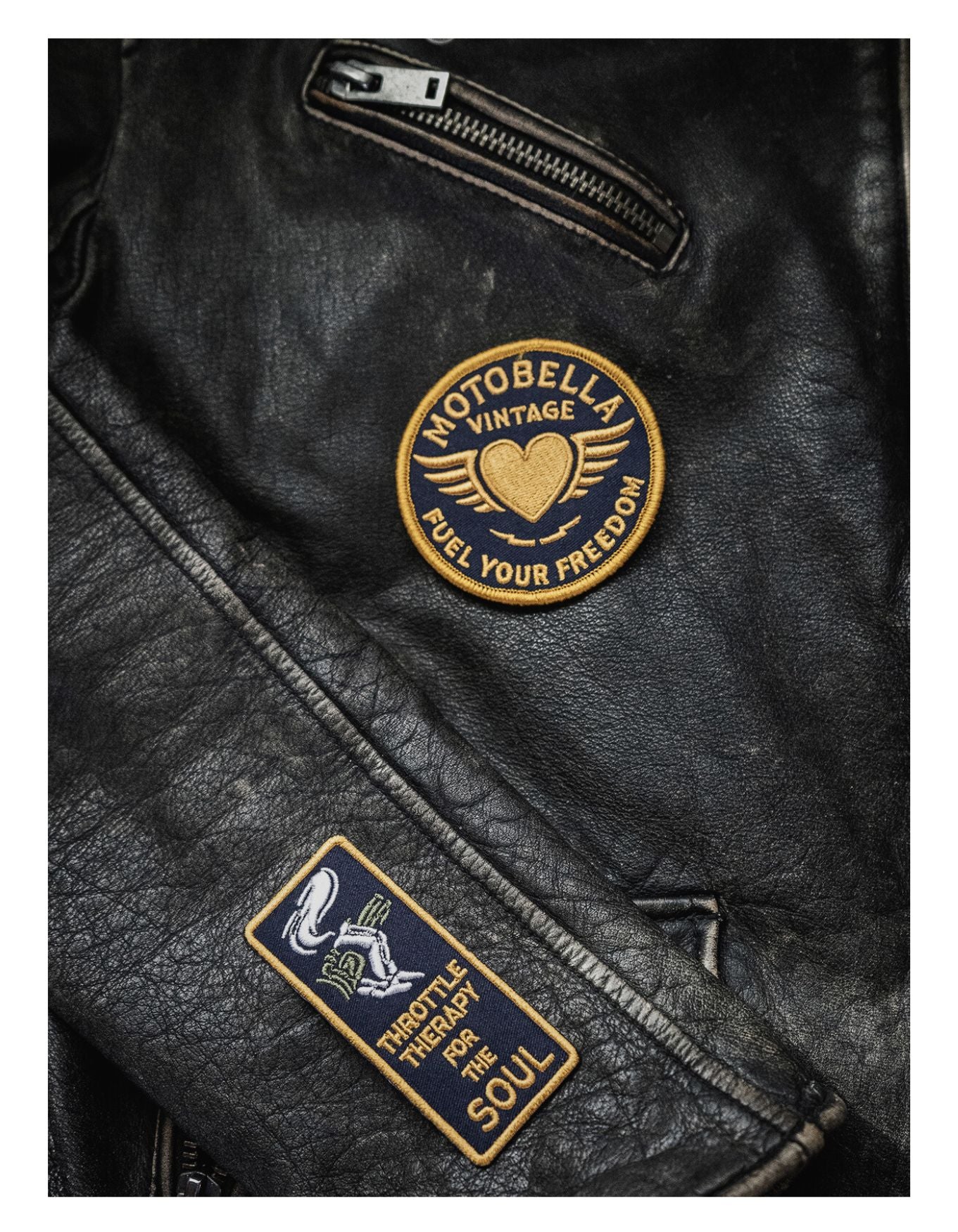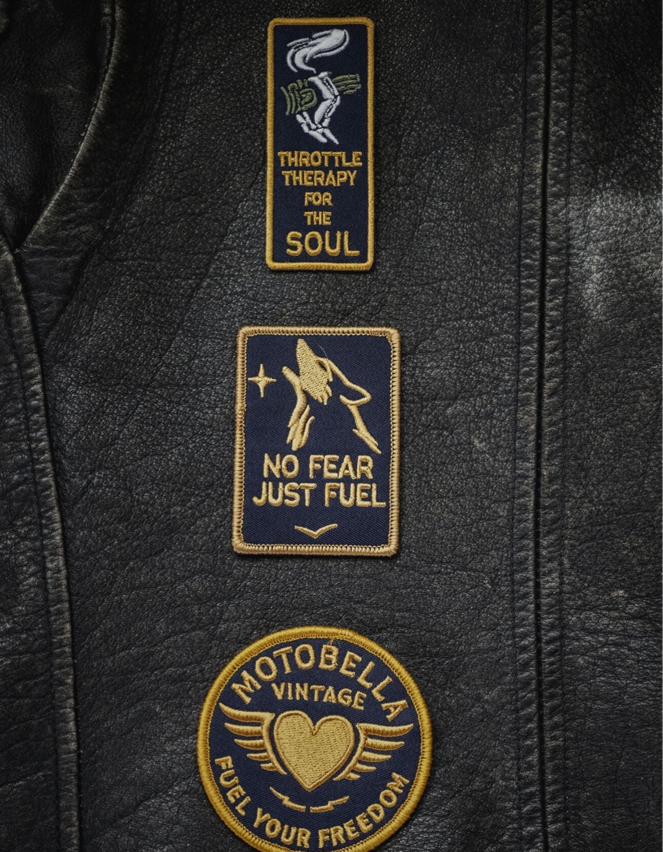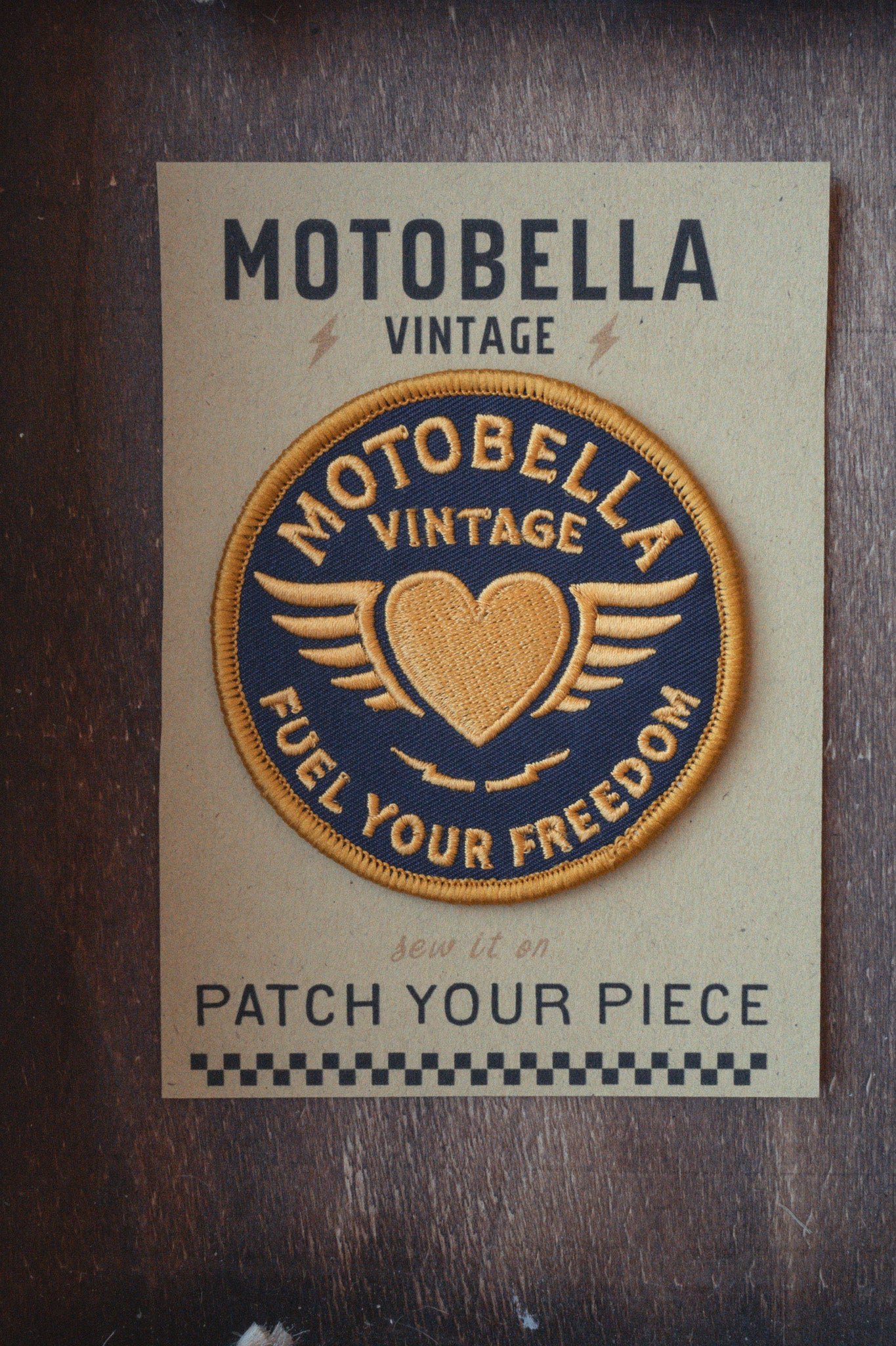 3" x 3" custom Motobella Vintage heart with wings patch. Embroidered in gold thread on a woven dark blue background. Limited-run batches, each one marks a truth, a memory, a moment earned. Stitch them to your coveralls, your bag, or gift one to someone on the path to fueling their own freedom.