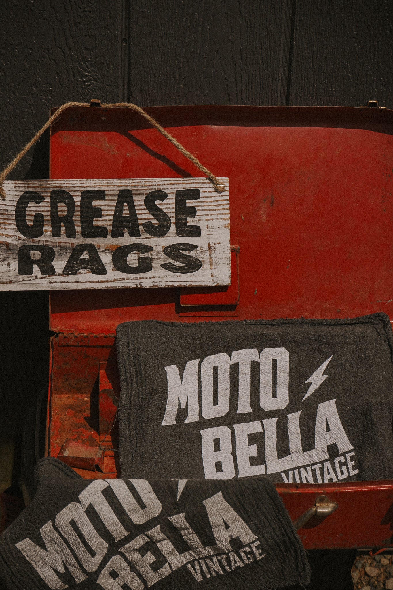 Equal parts grit and soul, the MotoBella Grease Rags are built for the workshop and the open road. Screen-printed with the bold MotoBella Vintage logo, these black cotton rags double as both functional shop towels and flags for your ride.