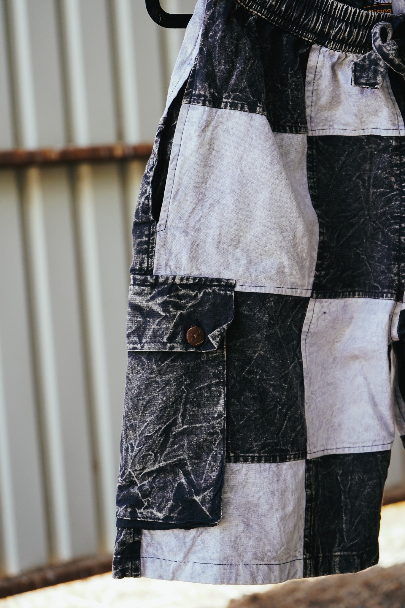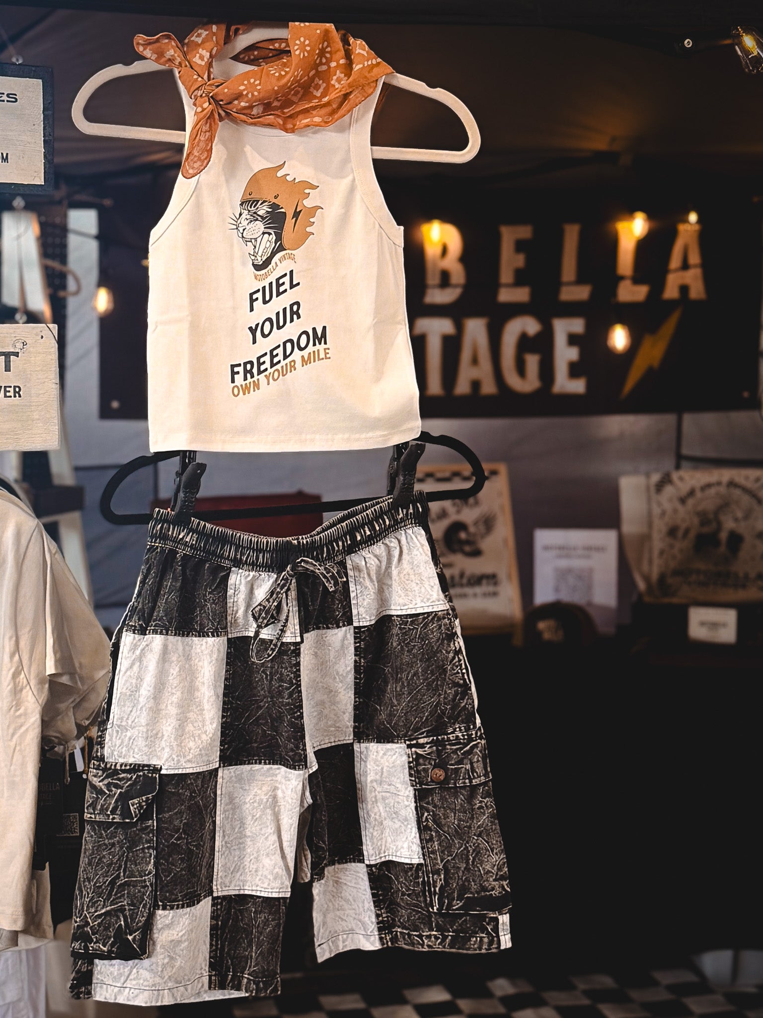 Loud, rugged, and ready for summer rides — the Checkered Rebel Shorts are MotoBella’s warm-weather essential. Handcrafted from bold black-and-white patchwork cotton, these shorts carry the same vintage grit as our overalls, cut down for everyday comfort and movement.