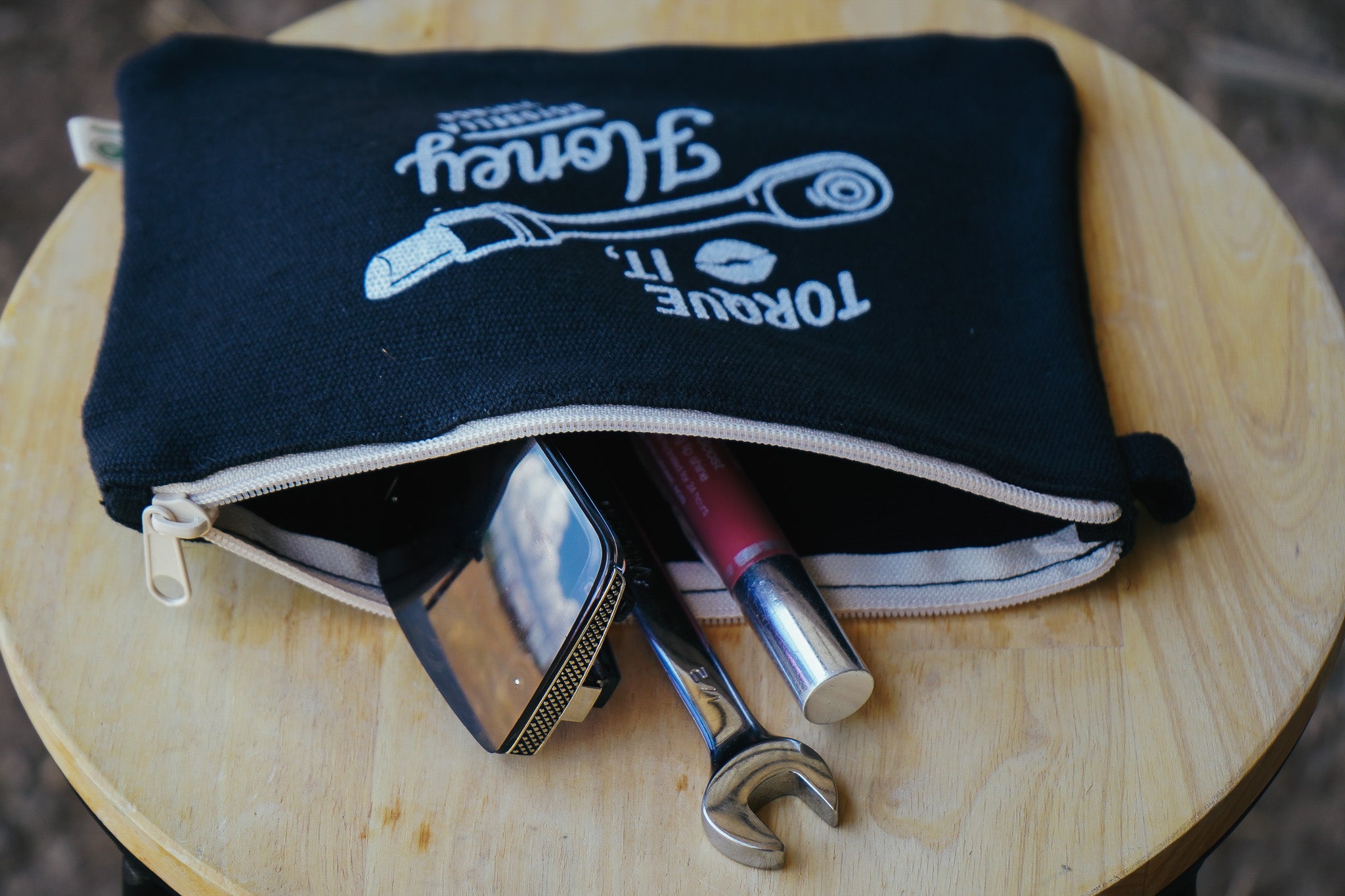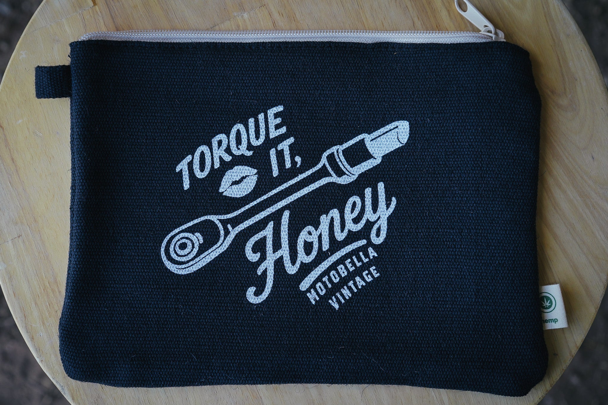 Equal parts sass and utility, the Torque It, Honey tool bag is made for riders who know how to keep it playful while staying prepared. Crafted from sturdy black hemp canvas with a vintage-style white print, this zip pouch is the perfect catch-all for wrenches, makeup, or rally essentials.