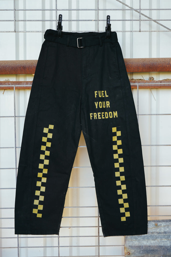 The Fuel Your Freedom Chino is your all-day ride companion — from the shop to the open road. Printed with vintage race-inspired gold checkers and crafted in small batches, because freedom should never be mass-produced.
