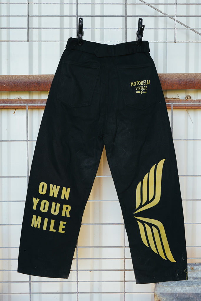 Printed Gold checkers + “FUEL YOUR FREEDOM, OWN YOUR MILE” in water-based ink